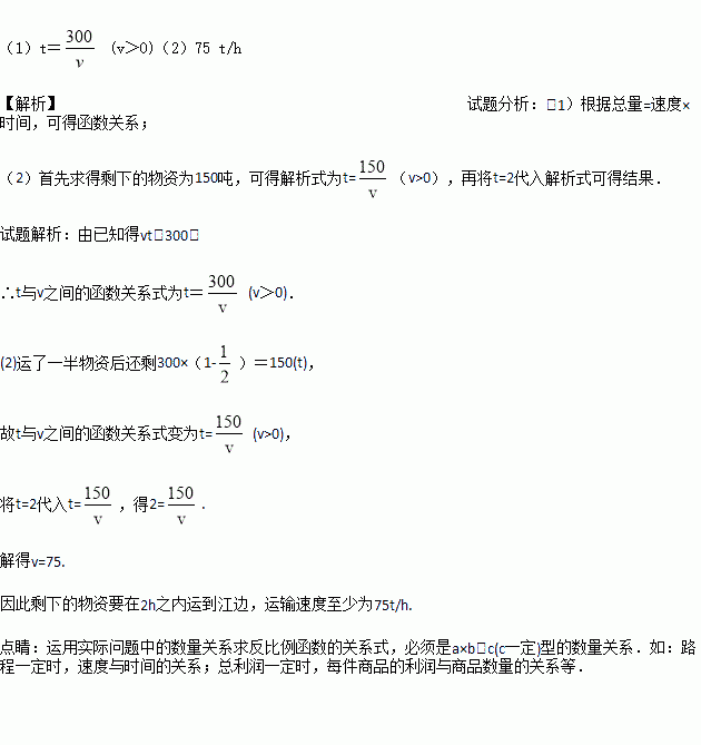 (1)运输时间t(单位:h)与运输速度v(单位:t/h)之间有怎样的函数关系式?