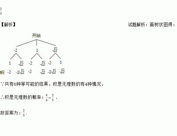 从-2、1、这三个数中任取两个不同的数相乘,积是无理数的概率是________.