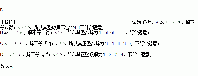 A. 2x+1>10 B. 2x+1≥9 C. x+5≤10 D. 3-x>-2