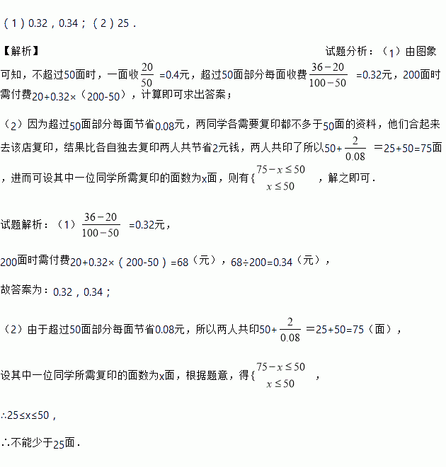 (2)两同学各需要复印都不多于50面的资料,他们合起来去该店复印,结果比各自独去复印两人共节省2元钱,问其中一位同学所需复印的面数不能少于多少面?