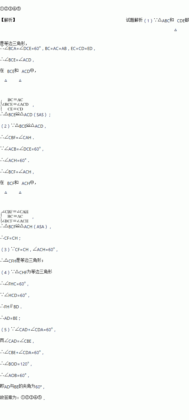 如图,已知点B.C.D在同一条直线上,△ABC和△CDE都是等边三角形.BE交AC于F,AD交CE于H.①△BCE ≌△ACD;②CF=CH;③△CFH为等边三角形;④FH∥BD;⑤AD与BE的夹角为60°,以上结论正确的是_____________.