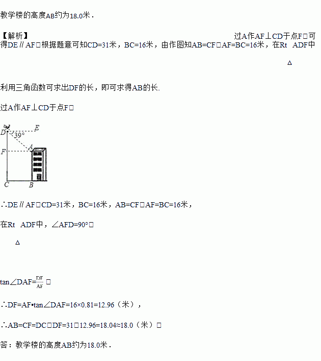 如图,某校无人机兴趣小组借助无人机测量教学楼的高度AB,无人机在离教学楼底部B处16米的C处垂直上升31米至D处,测得教学楼顶A处的俯角为39°,求教学楼的高度AB.(结果精确到0.1米)【参考数据:sin39°=0.63,cos39°=0.78,tan39°=0.81】