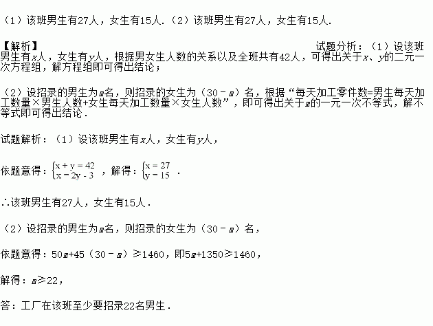(2)某工厂决定到该班招录30名学生,经测试,该班男、女生每天能加工的零件数分别为50个和45个,为保证他们每天加工的零件总数不少于1460个,那么至少要招录多少名男学生?