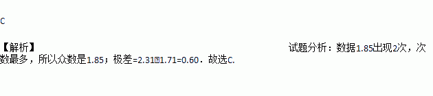)分别为:1.85,1.71,2.10,1.85,1.96,2.31.则这组数据的众数和极差分别是( )
