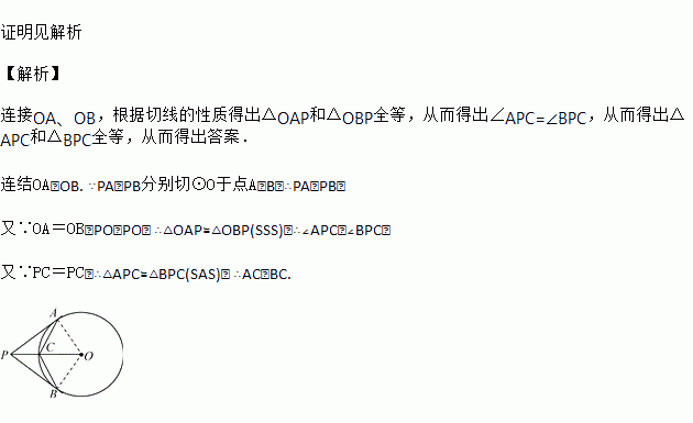 如图,PA、PB分别切⊙O于A、B,连接PO与⊙O相交于C,连接AC、BC,求证:AC=BC.