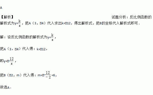 若点A(3,-4)、B(-2,m)在同一个反比例函数的图像上,则m的值为 ( )