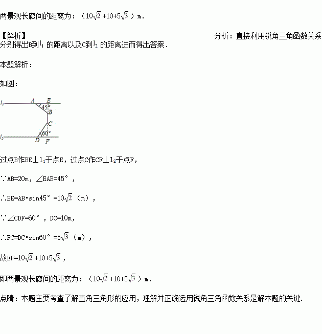 如图,在同一平面内,两条平行景观长廊l1和l2间有一条“U”形通道,其中AB段与景观长廊l1成45°角,长为20m;BC段与景观长廊垂直,长为10m,CD段与景观长廊l2成60°角,长为10m,求两景观长廊间的距离(结果保留根号).