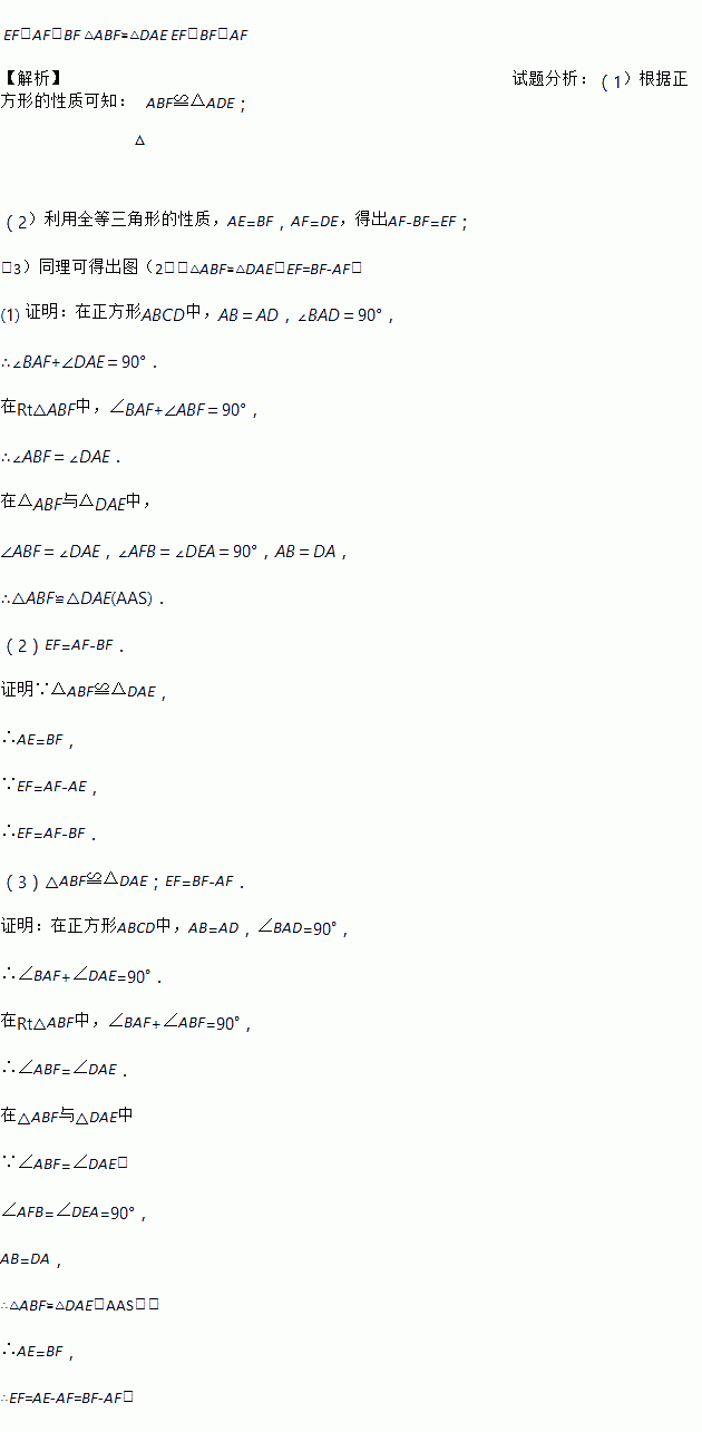 (3)如图(2)所示,若点G是CD边上任意一点(不与C,D两点重合),作BF⊥AG于点F,DE⊥AG于点E,那么图中的全等三角形是____,线段EF与AF,BF的等量关系是____.(不需证明,直接写出结论即可)