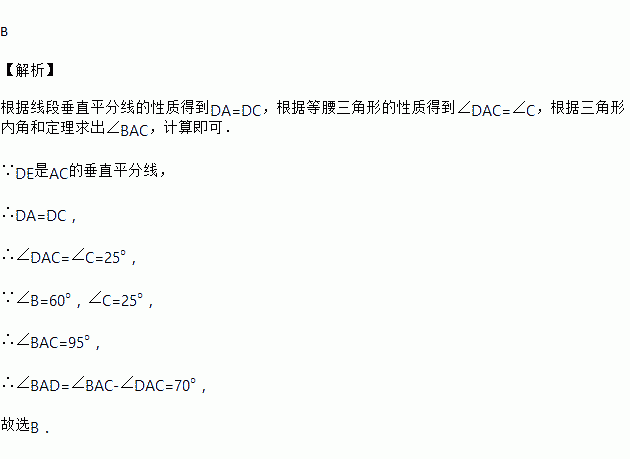 如图,在△ABC中,DE是AC的垂直平分线,且分别交BC,AC于点D和E,∠B=60°,∠C=25°,则∠BAD为( )