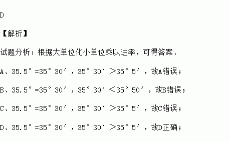 A.35.5°=35°5′ B.35.5°=35°50′ C.35.5°<35°5′ D.35.5°>35°5′