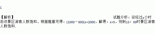 C 【解析】试题分析:设经过x小时后该景区游客人数饱和,根据题意可得:(1000-600)x=2000,解得:x=5,则到13:00时景区游客人数饱和.