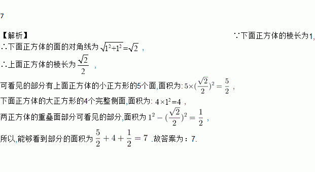 两个正方体形状的积木摆成如图所示的塔形平放于桌面上,上面正方体下底面的四个顶点恰好是下面相邻正方体的上底面各边的中点,并且下面正方体的棱长为1,则能被看到部分的面积为______.