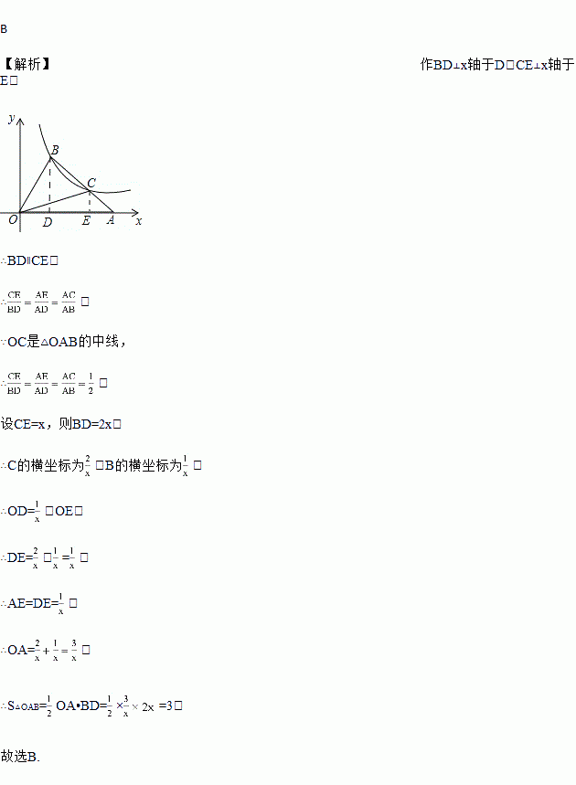 如图,在平面直角坐标系中,△OAB的顶点A在x轴正半轴上,OC是△OAB的中线,点B、C在反比例函数 的图象上,则△OAB的面积等于( )