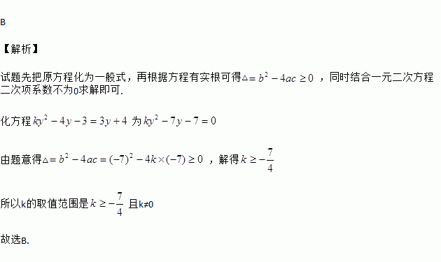 若关于y的一元二次方程ky2-4y-3=3y+4有实根,则k的取值范围是( )