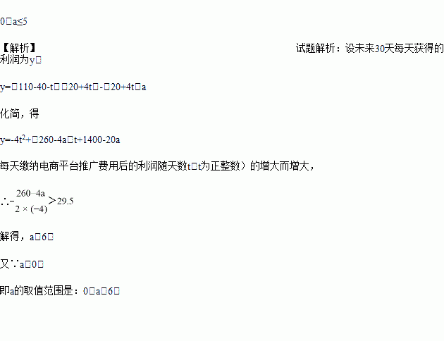 ijµçÉÌÏúÊÛÒ»¿îÏļ¾Ê±×°£¬½ø¼Û40Ôª/¼þ£¬ÊÛ¼Û110Ôª/¼þ£¬Ã¿ÌìÏúÊÛ20¼þ£¬Ã¿ÏúÊÛÒ»¼þÐè½ÉÄɵçÉÌÆ½Ì¨Íƹã·ÑÓÃaÔª£¨a£¾0£©¡£Î´À´30Ì죬Õâ¿îʱװ½«¿ªÕ¹¡°Ã¿Ìì½µ¼Û1Ôª¡±µÄÏÄÁî´ÙÏú»î¶¯£¬¼´´ÓµÚ1ÌìÆðÿÌìµÄµ¥¼Û¾ù±ÈǰһÌì½µ1Ôª¡£Í¨¹ýÊг¡µ÷Ñз¢ÏÖ£¬¸Ãʱװµ¥¼Ûÿ½µ1Ôª£¬Ã¿ÌìÏúÁ¿Ôö¼Ó4¼þ¡£ÔÚÕâ30ÌìÄÚ£¬ÒªÊ¹Ã¿Ìì½ÉÄɵçÉÌÆ½Ì¨Íƹã·ÑÓúóµÄÀûÈóËæÌìÊýt£¨tΪÕýÕûÊý£©µÄÔö´ó¶øÔö´ó£¬aµÄȡֵ·¶Î§Ó¦Îª_____________¡£