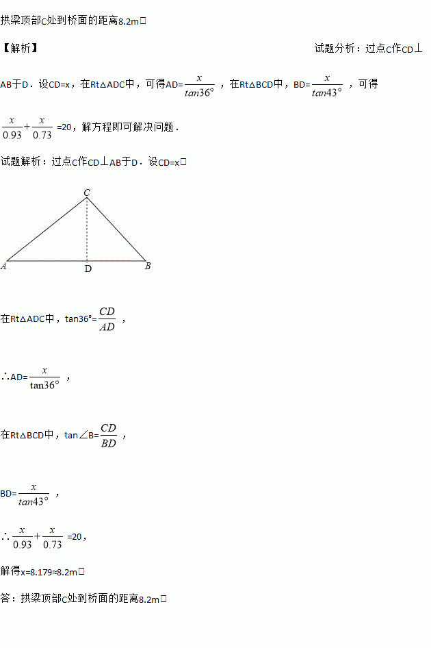 小芸和小刚分别在桥面上的A,B处,准备测量其中一座弧形钢架拱梁顶部C处到桥面的距离AB=20m,小芸在A处测得∠CAB=36°,小刚在B处测得∠CBA=43°,求弧形钢架拱梁顶部C处到桥面的距离.(结果精确到0.1m)(参考数据sin36°≈0.59,cos36°≈0.81,tan36°≈0.73,sin43°≈0.68,cos43°≈0.73,tan43°≈0.93)