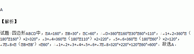 如图,四边形ABCD纸片中,已知∠A=160°,∠B=30°,∠C=60°,四边形ABCD纸片分别沿EF,GH,OP,MN折叠,使A与A′、B与B′、C与C′、D与D′重合,则∠1+∠2+∠3+∠4+∠5+∠6+∠7﹣∠8的值是( )