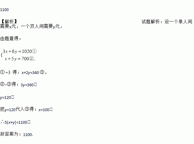 某宾馆有单人间和双人间两种房间,入住3个单人间和6个双人间共需1020元,入住1个单人间和5个双人间共需700元,则入住单人间和双人间各5个共需__元.