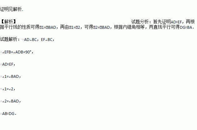 如图,已知AD⊥BC,EF⊥BC,∠1=∠2.求证:DG∥BA.