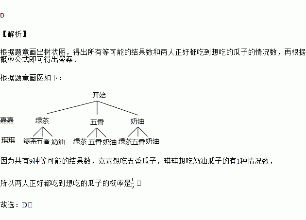 三个果盘分别盛有绿茶、五香、奶油三种口味的瓜子,嘉嘉想吃五香瓜子,琪琪想吃奶油瓜子,她们各自从中随机取一个瓜子,则两人正好都吃到想吃的瓜子的概率是( )