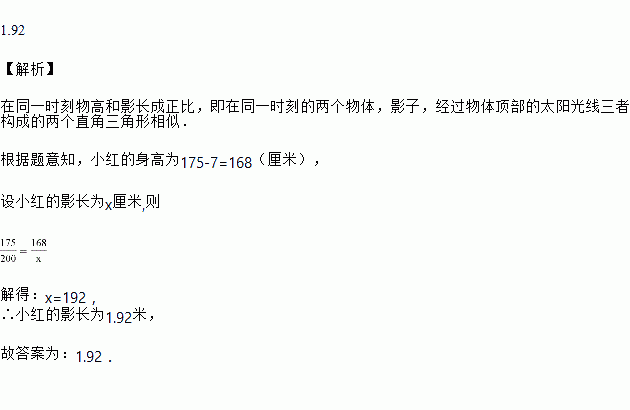 小明和小红在阳光下行走,小明身高1.75米,他的影长2.0米,小红比小明矮7厘米,此刻小红的影长是_____米.