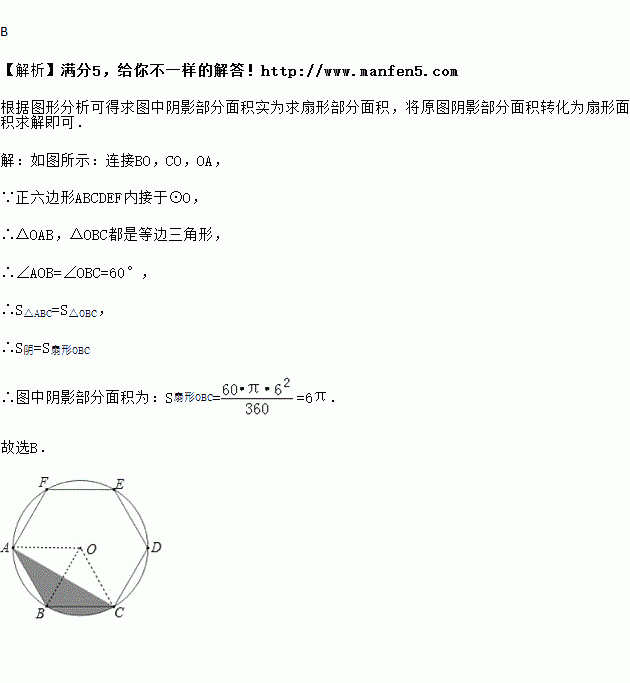 如图,正六边形ABCDEF内接于⊙O,若⊙O的半径为6,则阴影部分的面积为( )