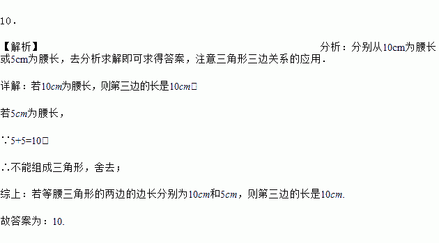 若等腰三角形的两边的边长分别为10cm和5cm,则第三边的长是_____cm.