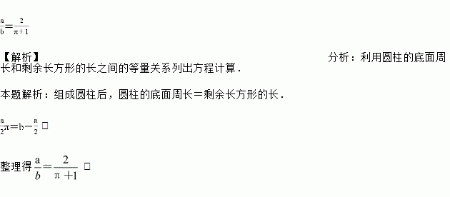 如图,矩形的长与宽分别为a和b,在矩形中截取两个大小相同的圆作为圆柱的上下底面,剩余的矩形作为圆柱的侧面,刚好能组合成一个没有空隙的圆柱,则a和b要满足什么数量关系?