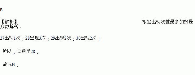 某班数学兴趣小组8名同学的毕业升学体育测试成绩依次为:30,29,28,27,28,29,30,28,这组数据的众数是( )