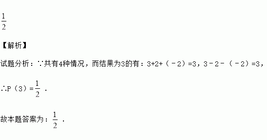 【解析】 试题分析:∵共有4种情况,而结果为3的有:3+2+(﹣2)=3,3﹣2﹣(﹣2)=3, ∴P(3)=. 故本题答案为:.