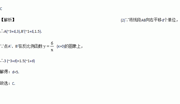 如图,已知A(-3,3),B(-1,1.5),将线段AB向右平移d个单位长度后,点A、B恰好同时落在反比例函数 (x>0)的图象上,则d等于( )