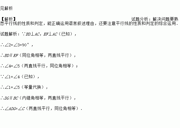 Èçͼ£¬ÒÑÖªBD¡ÍAC£¬EF¡ÍAC£¬D¡¢F·Ö±ðΪ´¹×㣬ÇÒ¡Ï1=¡Ï4£¬ÇóÖ¤£º¡ÏADG=¡ÏC