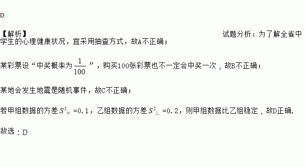 D. 若甲组数据的方差=0.1,乙组数据的方差=0.2,则甲组数据比乙组稳定