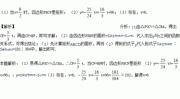 (3)是否存在某一时刻t,使S四边形PBEF ∶ S矩形ABCD=181∶384若存在,求出t的值;若不存在,请说明理由. (提示:1722=29584)