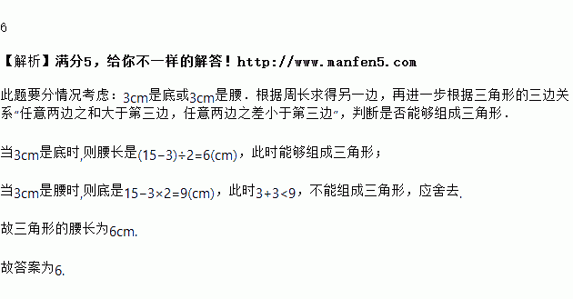 已知一个等腰三角形一边长为3,周长为15,则它的腰长等于_____.