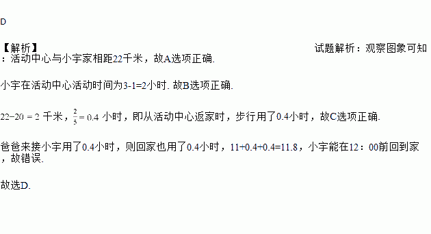 小宇在周日上午8:00从家出发,乘车1小时到达某活动中心参加实践活动.11:00时他在活动中心