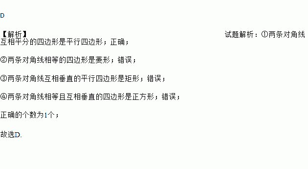 ①两条对角线互相平分的四边形是平行四边形②两条对角线相等的四边形是菱形③两条对角线互相垂直的四边形是正方形④两条对角线相等且互相垂直的四边形是正方形