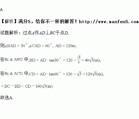 如图,热气球的探测器显示,从热气球A处看一栋楼顶部B处的仰角为30°,看这栋楼底部C处的俯角为60°,热气球A处与楼的水平距离为120 m,则这栋楼的高度为( )