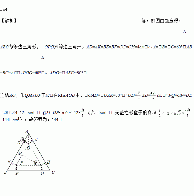 如图,以边长为20cm的正三角形纸板的各顶点为端点,在各边上分别截取4cm长的六条线段,过截得的六个端点作所在边的垂线,形成三个有两个直角的四边形.把它们沿图中 虛线剪掉,用剩下的纸板折成一个底为正三角形的无盖柱形盒子,则它的容积为________cm3 .