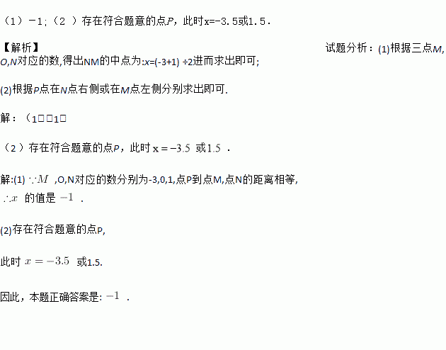 (1)-1;(2 )存在符合题意的点P,此时x=-3.5或1.5. 【解析】试题分析:(1)根据三点M,O,N对应的数,得出NM的中点为:x=(-3+1) ÷2进而求出即可; (2)根据P点在N点右侧或在M点左侧分别求出即可. 【解析】 (1)-1. (2 )存在符合题意的点P,此时或. 解:(1),O,N对应的数分别为-3,0,1,点P到点M,点N的距离相等, ...