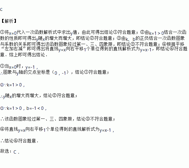 关于一次函数y=x﹣1,下列说法:①图象与y轴的交点坐标是(0,﹣1);②y随x的增大而增大;③图象经过第一、二、三象限; ④直线y=x﹣1可以看作由直线y=x向右平移1个单位得到.其中正确的有( )