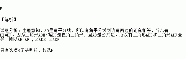 B 【解析】 试题分析:由题意知,AD是角平分线,所以有角平分线到该角两边的距离相等,所以有DE=DF,因为三角形ADE和ADF是直角三角形,且AD是公共边,所以有三角形ADE和三角形ADF全等,所以AE=AF ,∠ADE=∠ADF 只有选项B无法判断,故选B