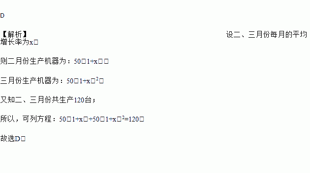 某厂一月份生产产品50台,计划二、三月份共生产产品120台,设二、三月份平均每月增长率为x,根据题意,可列出方程为( )
