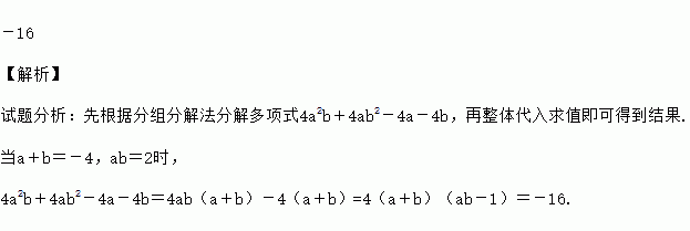 已知a+b=-4,ab=2,求多项式4a2b+4ab2-4a-4b的值。