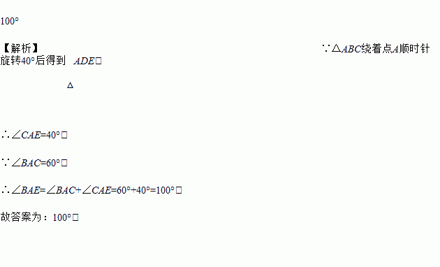 如图,在△ABC中,∠BAC=60°,将△ABC绕着点A顺时针旋转40°后得到△ADE,则∠BAE=_____.