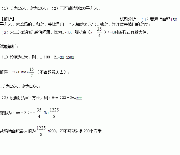 (1)若墙长为18米,要围成鸡场的面积为150平方米,则鸡场的长和宽各为多少米?