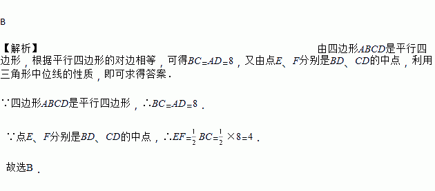 如图,在平行四边行 ABCD 中,AD=8,点 E、F 分别是BD、CD 的中点, 则 EF 等于( )