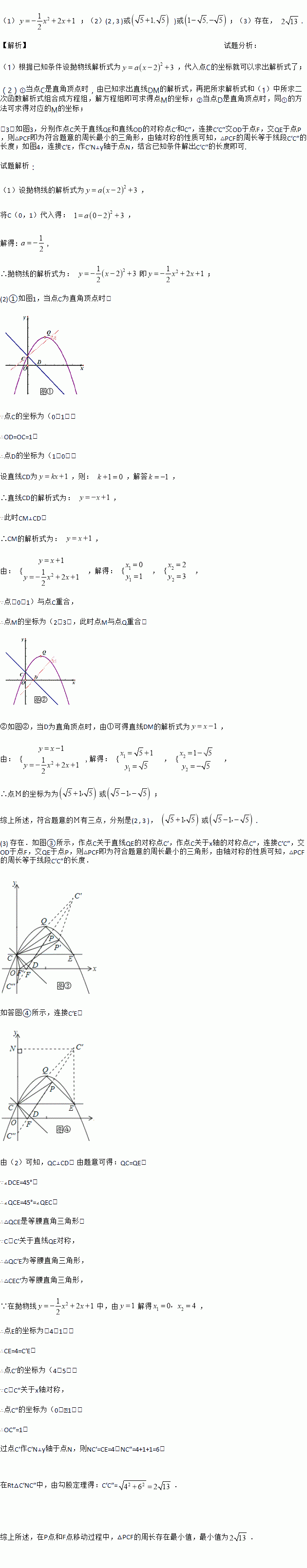 (3)将直线CD绕点C逆时针方向旋转45°所得直线与抛物线相交于另一点E,连接QE.若点P是线段QE上的动点,点F是线段OD上的动点,问:在P点和F点的移动过程中,△PCF的周长是否存在最小值?若存在,求出这个最小值,若不存在,请说明理由.