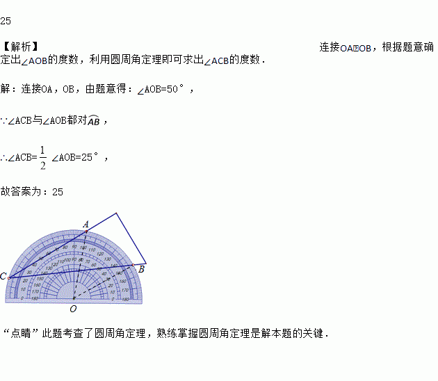 将量角器按如图所示的方式放置在三角形纸板上,使顶点在半圆上,点、的读数分别为100°、150°,则∠ACB的大小为______度.