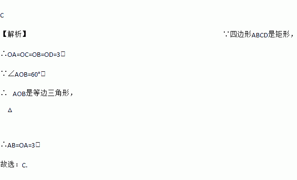 如图,在矩形ABCD中,对角线AC,BD相交于点O,∠AOB=60°, AC=6 cm,则AB的长是( )